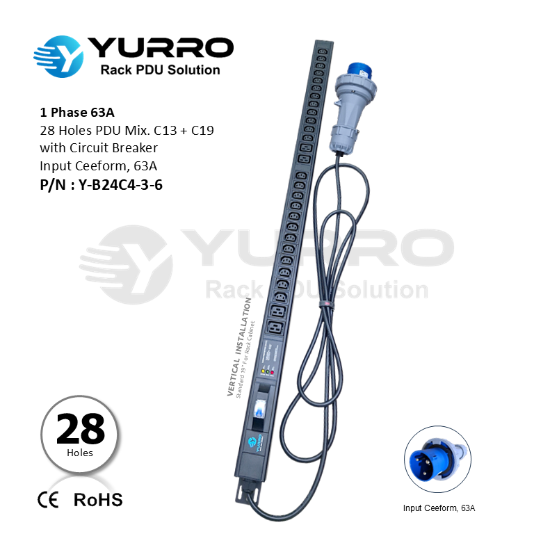 1 Phase 63A, 28 Holes PDU Mix. C13+C19 with Circuit Breaker