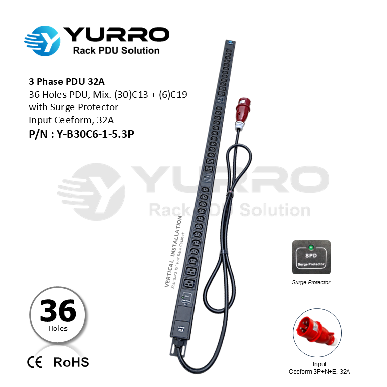 3 Phase PDU 32A, 36 Holes Mix. C13+C19 with Surge Protector